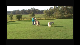 August 13, 2009 Charm doing Obedience training. Video of Charm and Teresa doing light obedience training at home with Shay and Sonoma helping out as a distraction. Shay is also harassing Teresa for more treats. Then... next door neighbor lets out their dog and all three run to the fence. Lots of confusion at first because Sandy likes to run in big circles so she does not run the length of the fence. As you can see it causes a 3 wolfhound pile up at first. Click on picture to the left to see video