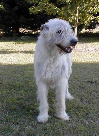 Cove Creek's Clancy Allen - Clancy joined us in April 1996 at 11 weeks of age. After having been informally interviewed by his breeder. Which required a visited with his breeder 2 times; driving 130 + miles one way before we were approved and before Clancy was even born. This was a great opportunity to get to know Clancy's breeder and learn more about her and her hounds (Patricia Falvey-Looper). Today if you are thinking about getting a puppy be prepared. Most reputable breeders will insist on doing an interview and contracts with prospective buyers. They're first concern is for the well fare of that puppy and where it will be living the rest of it's life. For the first time when we had questions or just wanted to share something special with his breeder we felt comfortable about picking up the phone to call Pat. Clancy has a typical Irish wolfhound temperament. Clancy however was our first chow hound. Devouring anything you put in his bowl. Soon we had an overweight hound with the help of his breeder and an appropriate diet we have been successful at maintaining his correct weight. Almost 5 months after celebrating Clancy's 10th Birthday, with great sorrow and much heartbreak we had to let our beloved Clancy go July 24,2006. He was the changing force behind our lives and wolfhounds. His presence was undoubtedly larger than life. Run like the wind our Sweet Clancy until we meet again we will send our love on the wings of butterflies.